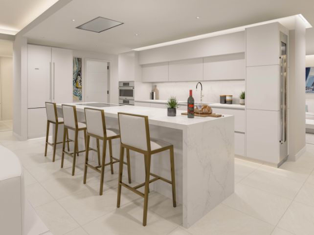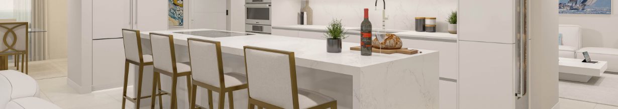 Subtle under-cabinet kitchen lighting creates a lovely balance with the natural light flowing into the space. Sleek porcelain flooring and quartz countertops create elegance and finesse.